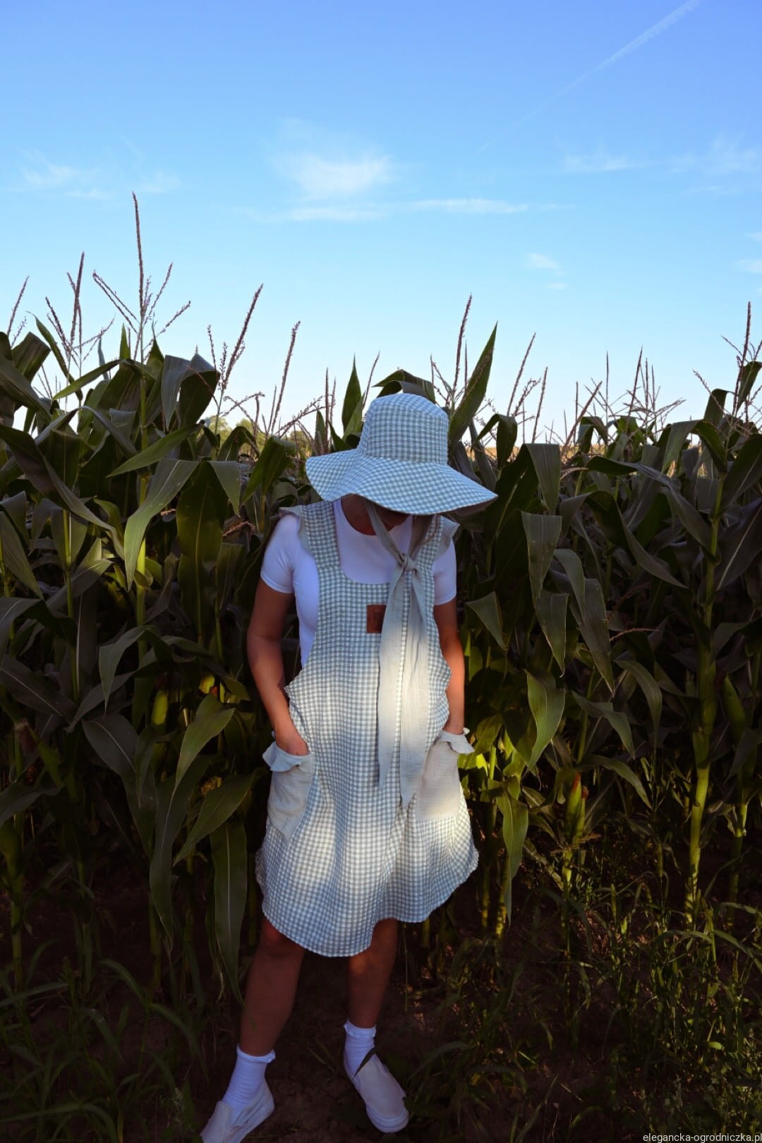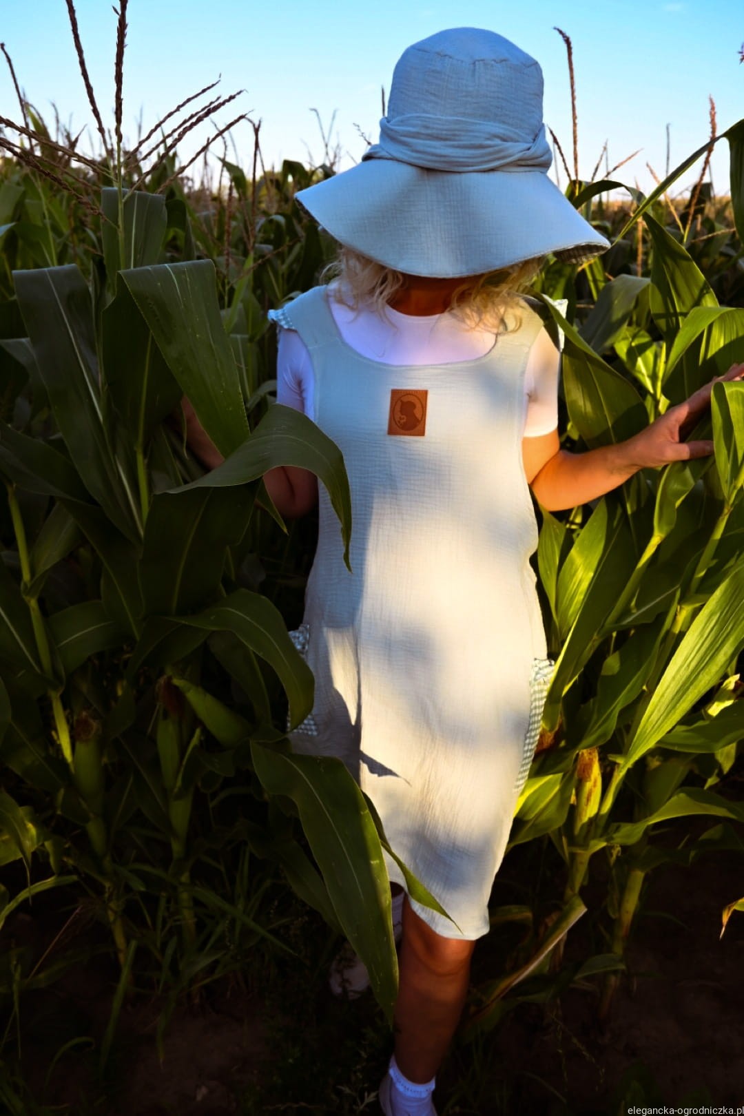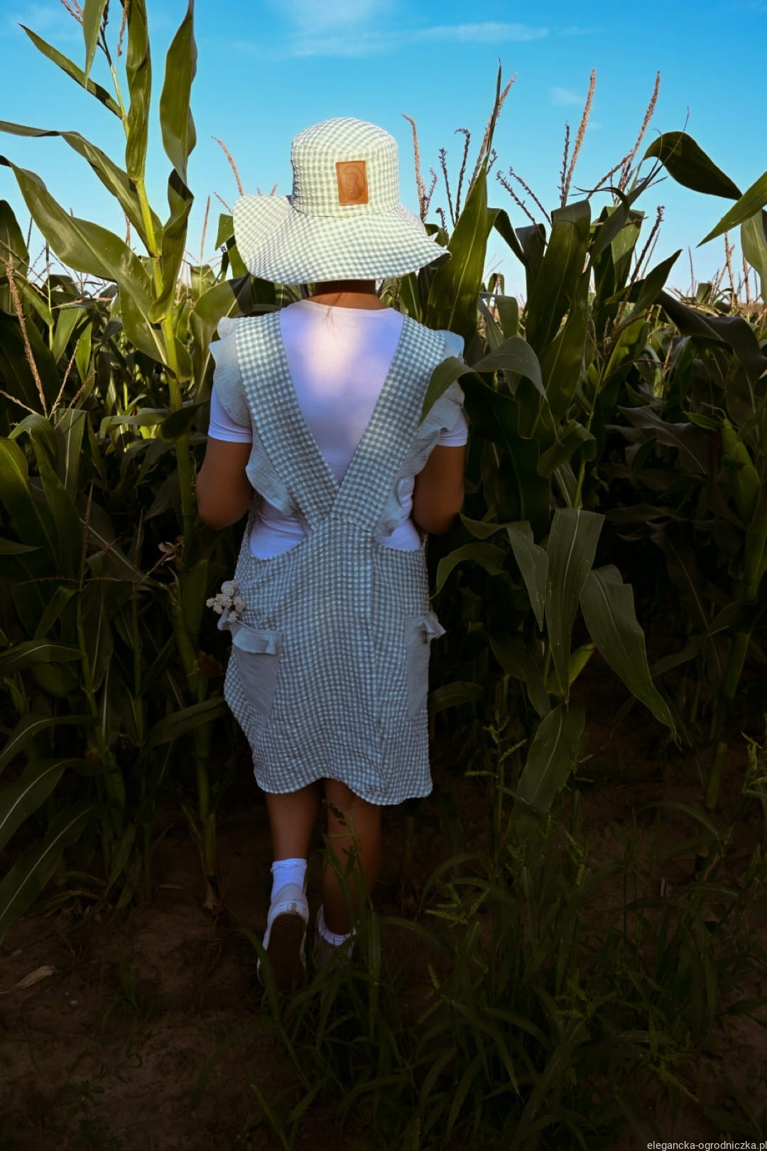 Bawełniany fartuszek z szelkami na krzyż i dwoma kieszeniami, ozdobionymi uroczymi falbankami.