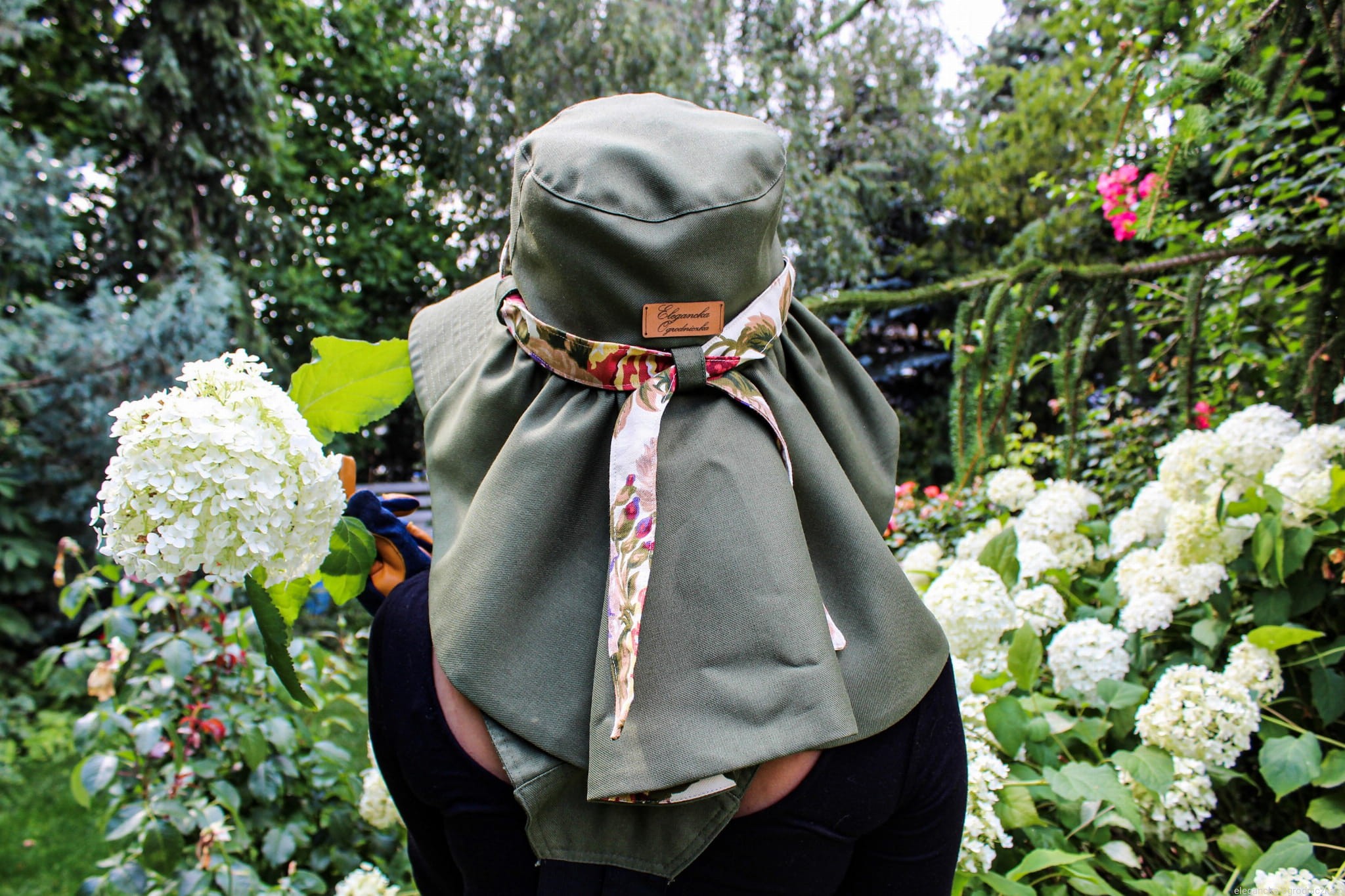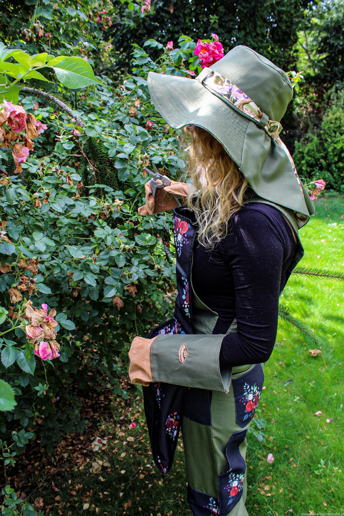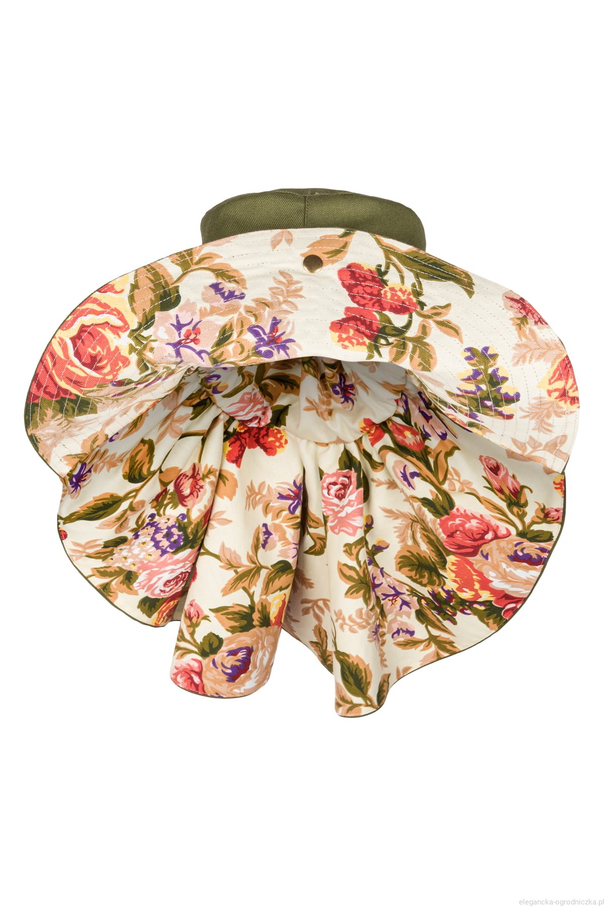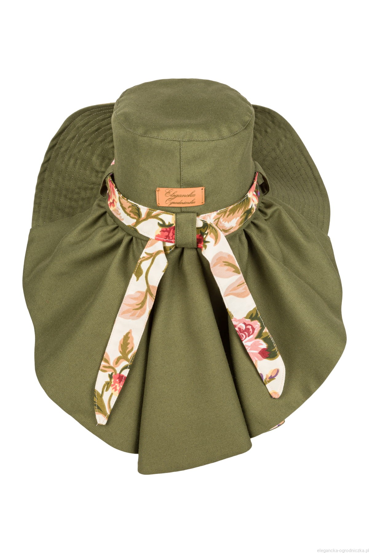 Stylowy kapelusz z kokardą i specjalnym przedłużanym rondem chroni głowę i szyję przed promieniami słonecznymi oraz owadami. Praktyczny podczas prac ogrodowych, szykowny po pracy podczas przyjęcia w ogrodzie. Napy umożliwiają przyczepienie ronda do główki.