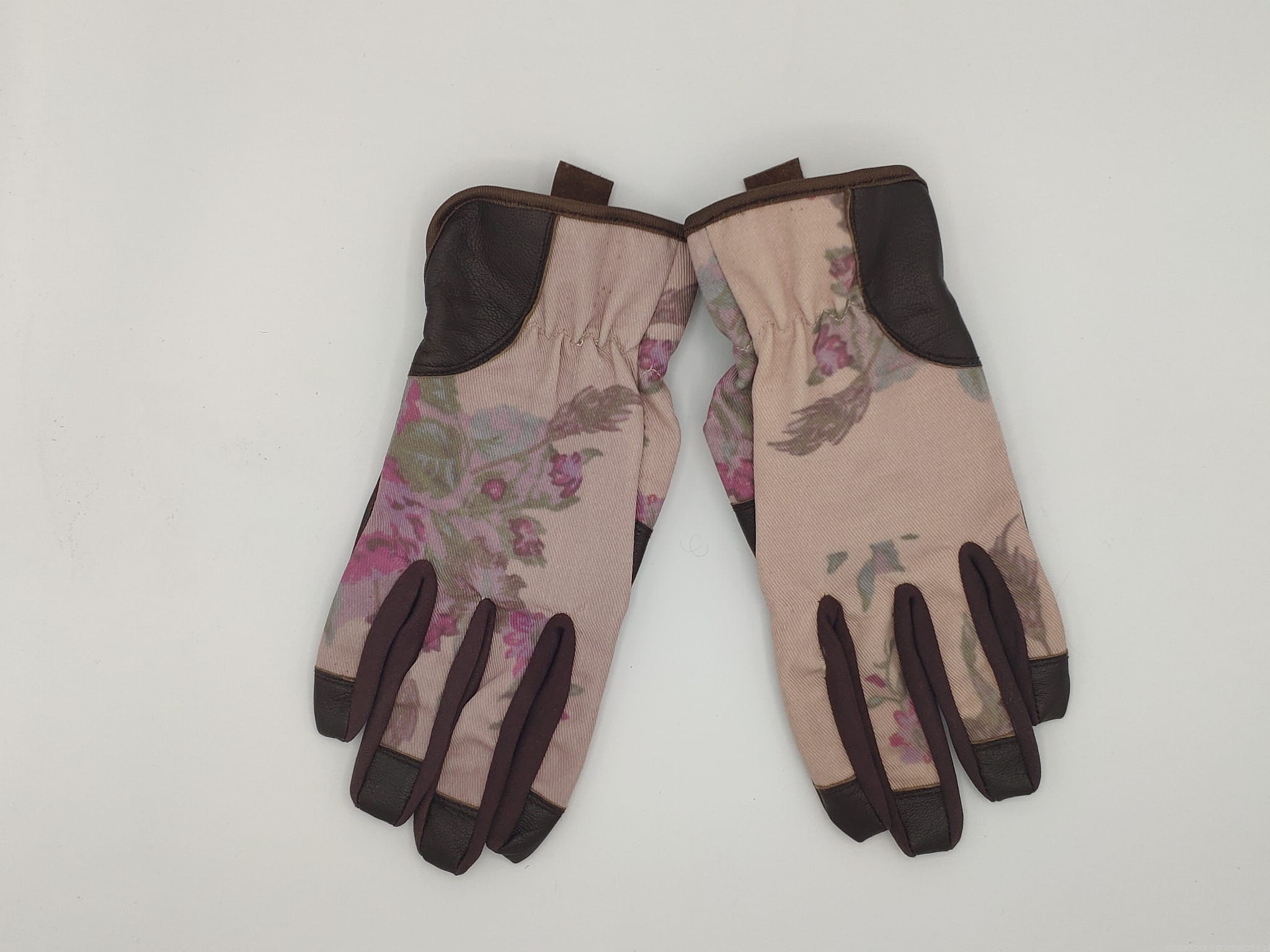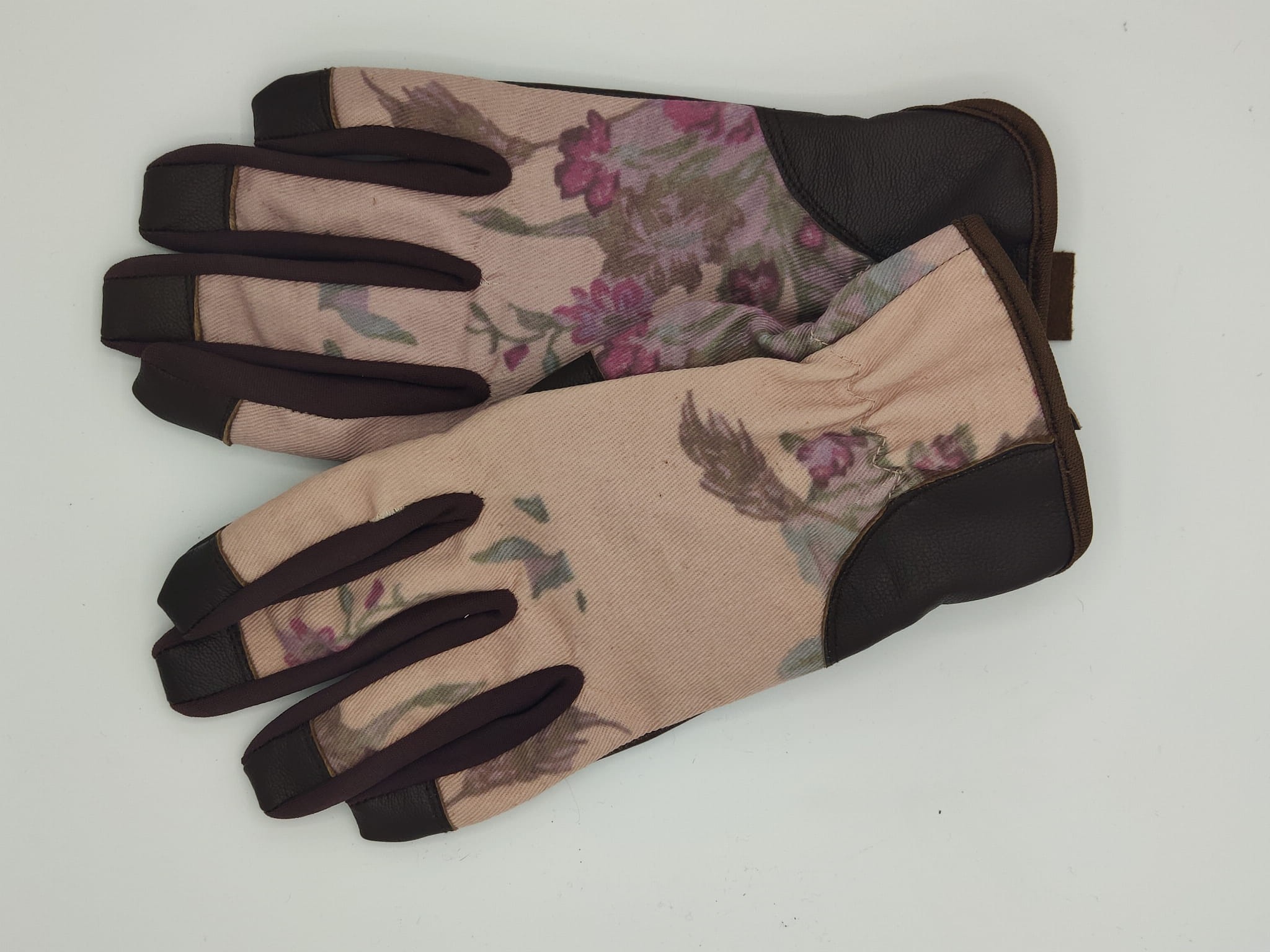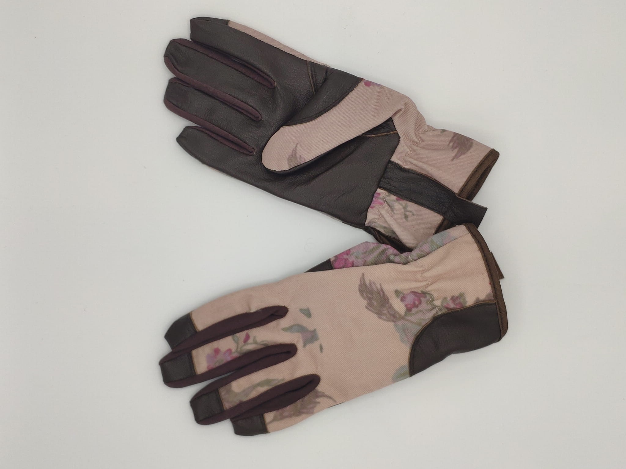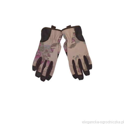Uniwersalne rękawice ogrodowe wykonane ze skóry koźlęcej od spodu i z mocnego bawełnianego materiału z klasycznym motywem kwiatowym z wierzchu. Bezszwowe końcówki palców zapewniają pewny chwyt i dobre czucie.