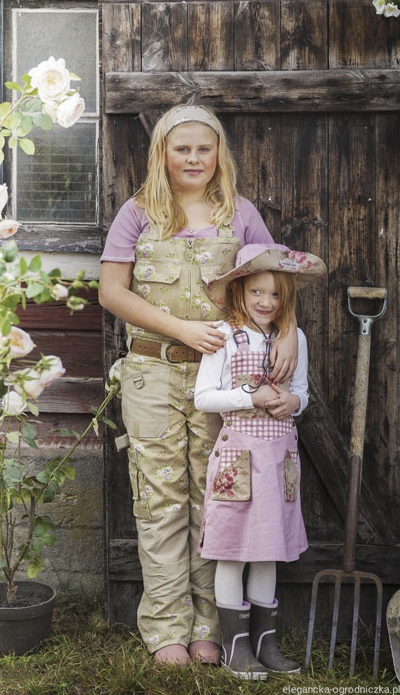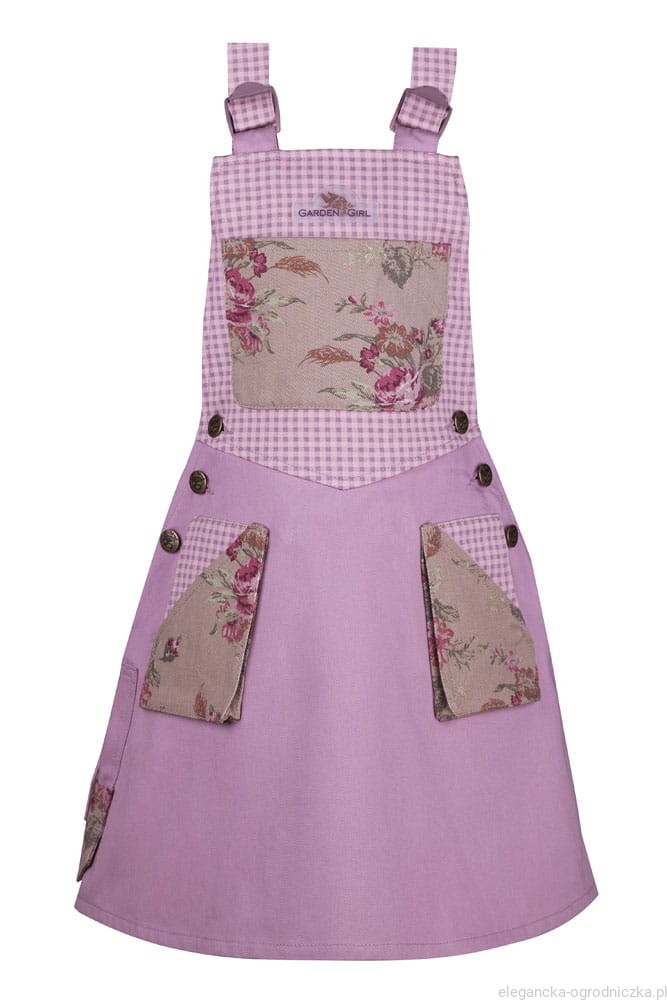 Ładna sukienka za kolana na szelkach z dużymi kieszeniami. Idealna dla córki, która chciałaby pomóc mamie w pracach ogrodowych, a przy tym elegancko wyglądać.